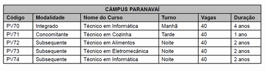 Em Paranavaí o IFPR ofertará 200 vagas em cursos técnicos de nível médio totalmente gratuitos, conforme a tabela a seguir: