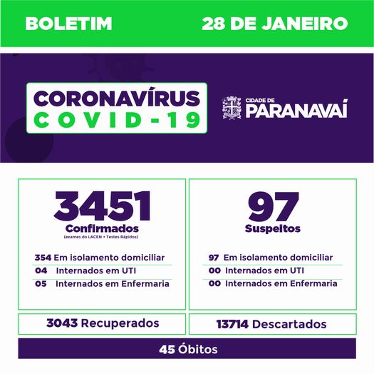 Até o final da tarde desta quinta-feira, o relatório apontava quarenta e cinco óbitos em Paranavaí, três mil, quatrocentos e cinquenta e uma confirmações de Covid-19 em Paranavaí (LACEN + Testes Rápidos + PCR ultrassensível), noventa e sete suspeitos testados para Coronavírus aguardando resultado e treze mil, setecentos e catorze casos descartados. Até o momento são três mil e quarenta e três os casos recuperados. Os casos notificados, de pessoas que apresentaram “síndrome gripal”, não foram divulgados.